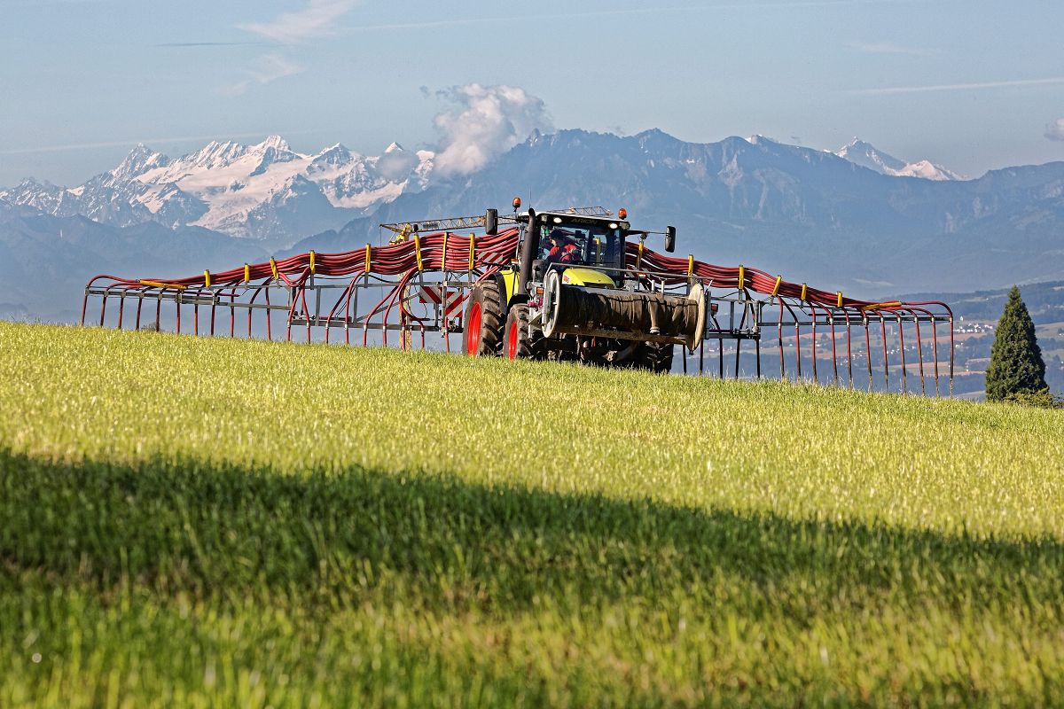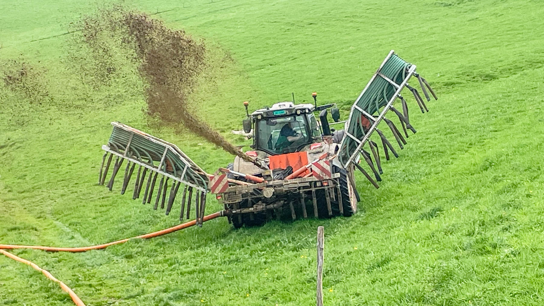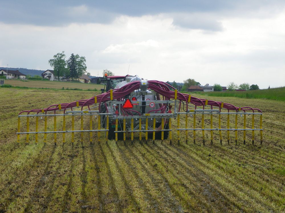 Unsere Schleppschlauchverteiler sind mit Durchflusszähler ausgerüstet. Dadurch können wir die gewünschte Menge Gülle pro Hektar exakt ausbringen und sie wissen genau, wie viel Gülle wir verschlaucht haben.
