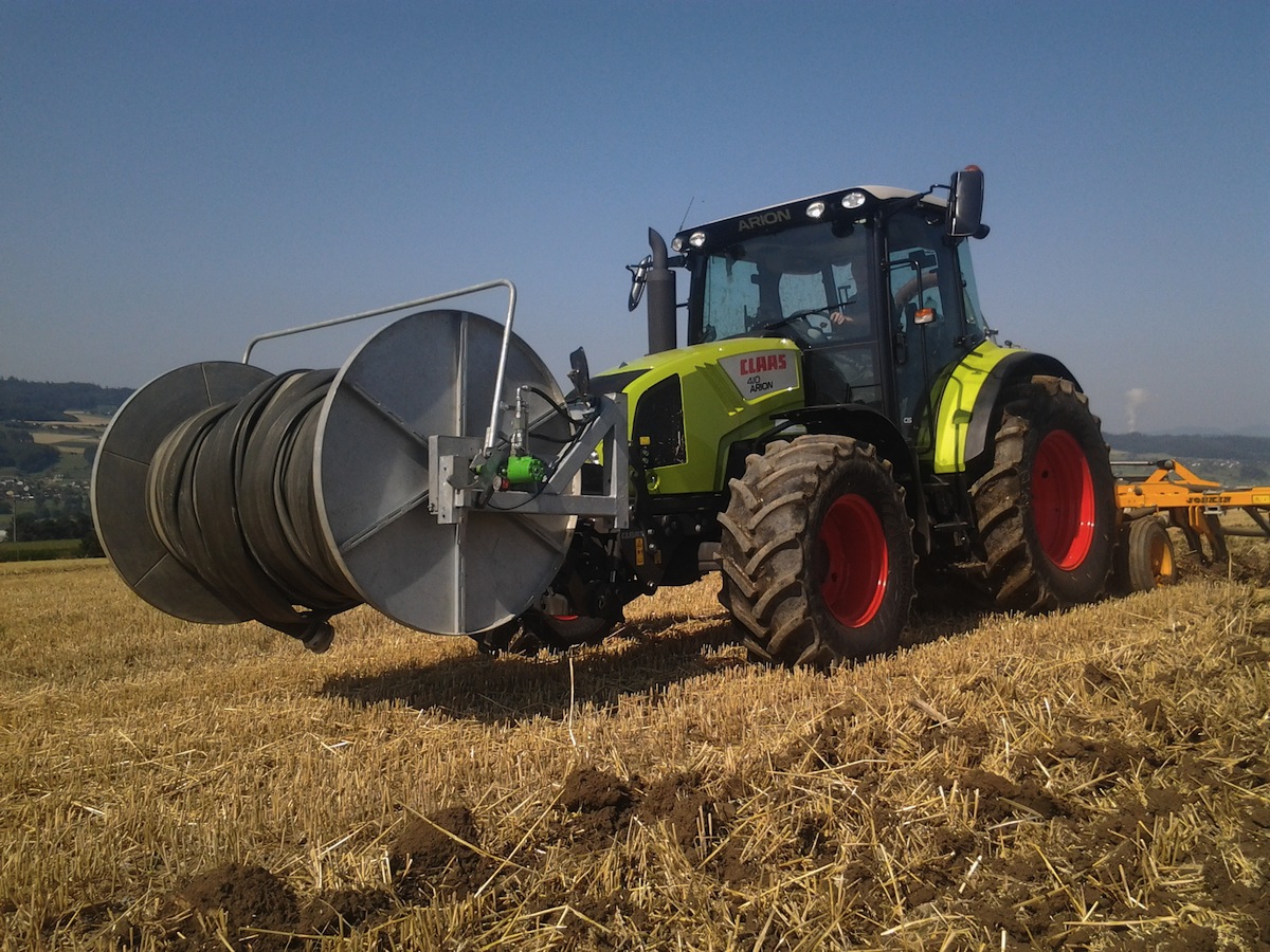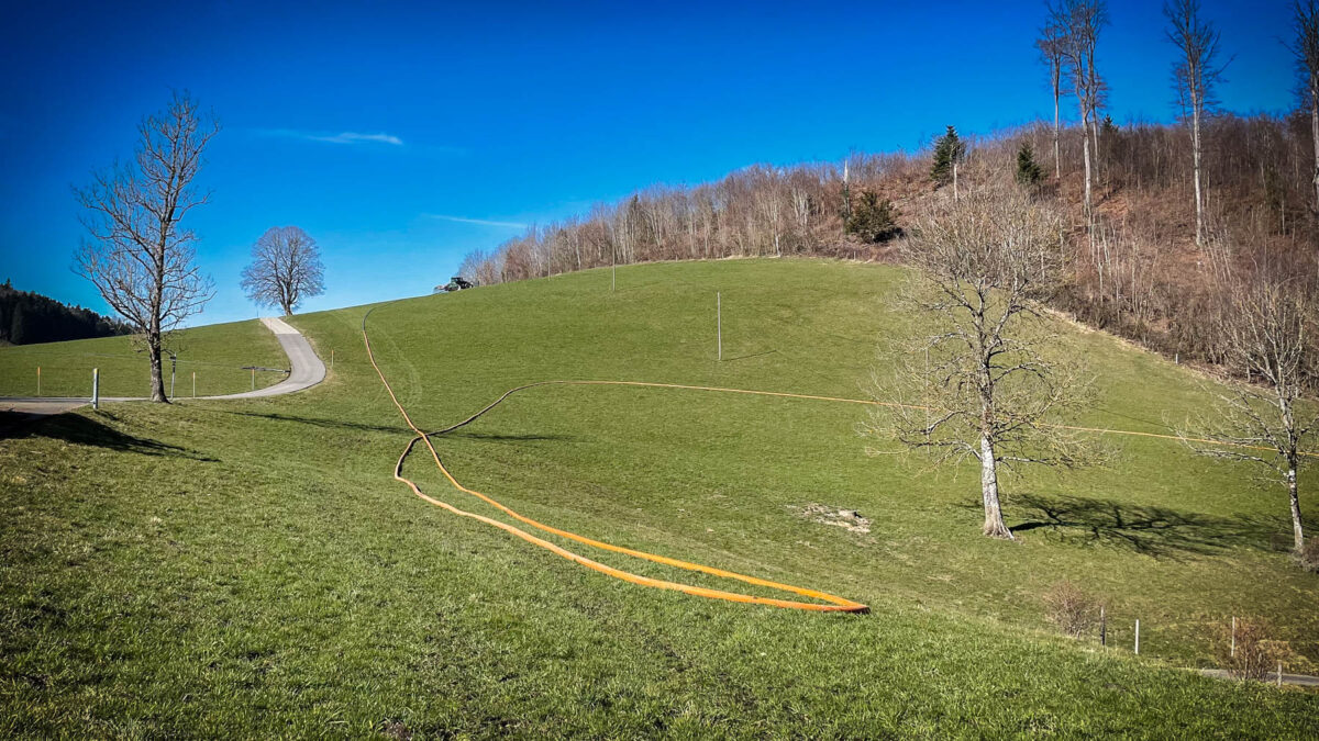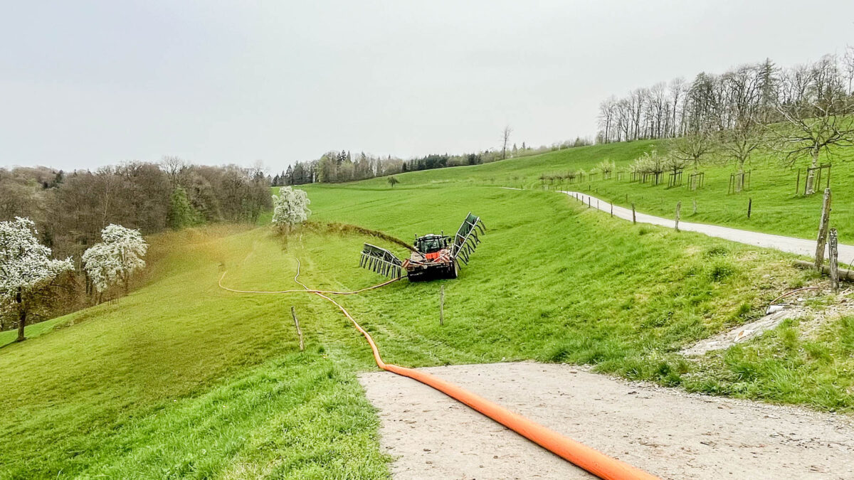 Für Parzellen bis 2 Kilometer Entfernung von der Güllegrube das schnellste und kostengünstigste Verfahren zur Güllenausbringung. Unsere Pumpe wird von einem Dieselmotor angetrieben und leistet durchschnittlich 120m³ pro Stunde. Bei Parzellenwechsel oder nach vollendeter Arbeit spülen wir die Schläuche mit Wasser und blasen sie mit Pressluft aus. So ist sämtliche Gülle perfekt verteilt, beim Schläuche zusammen rollen bleibt allenfalls etwas Wasser zurück.