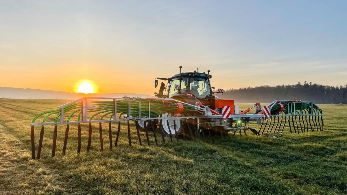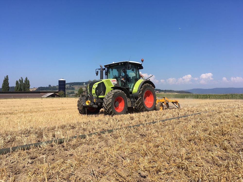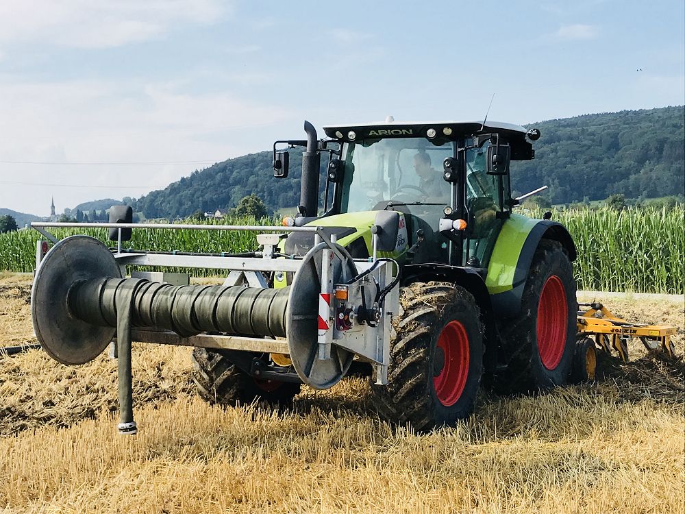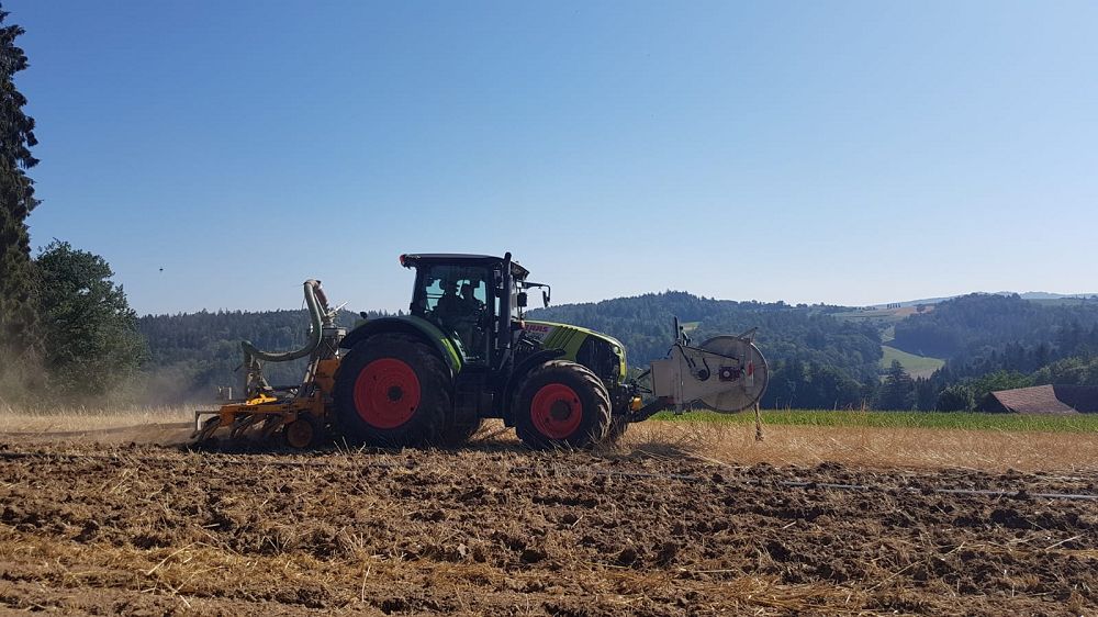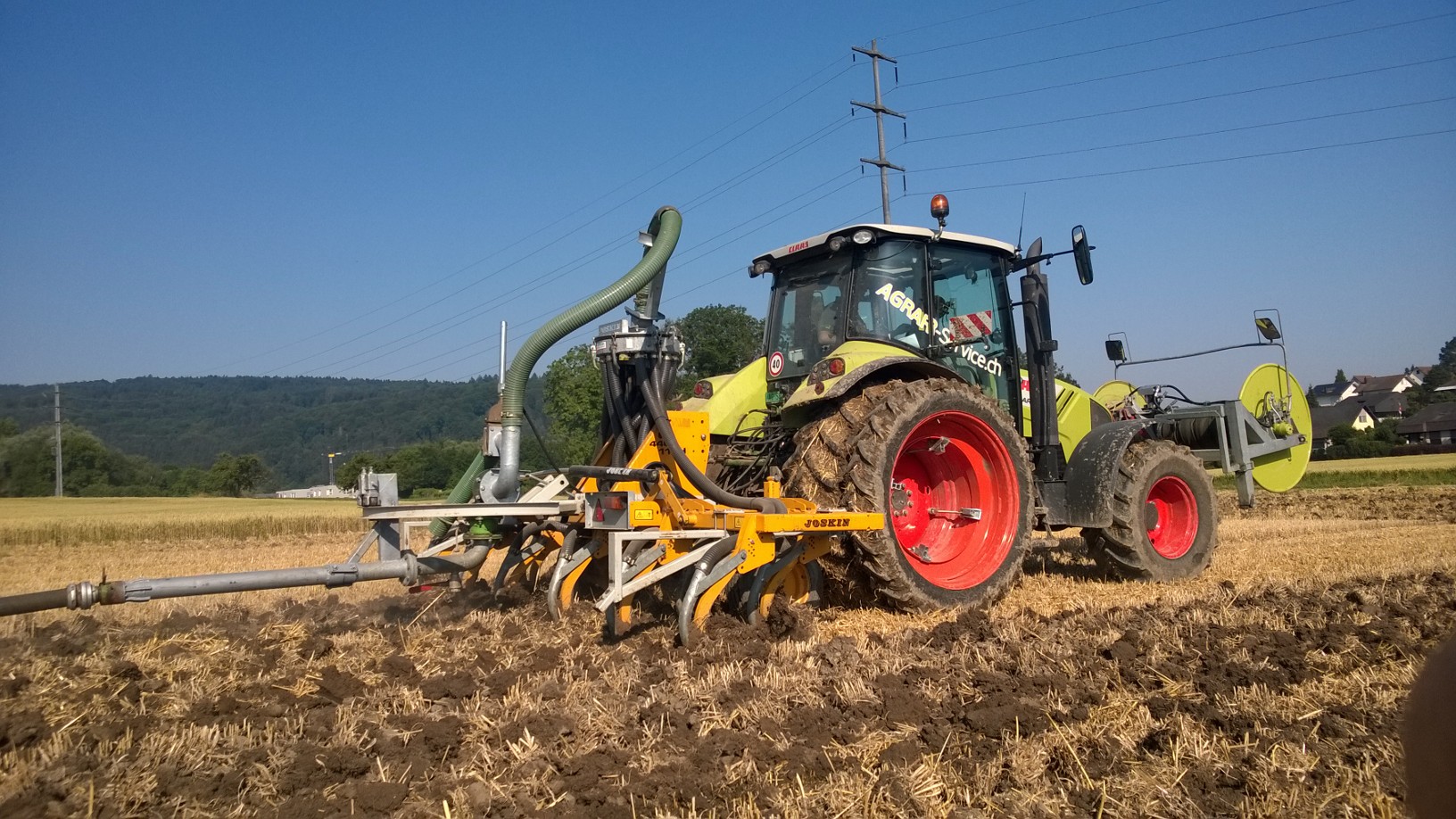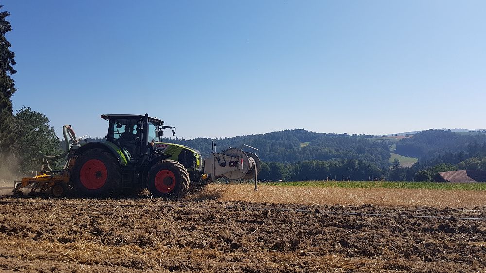 Nach der Getreideernte stehen die Stoppelbearbeitung und die Anlage von Kunstwiesen oder Gründüngungen an. Mit unserem Güllegrubber erledigen wir zwei Arbeitsschritte in Einem: Nicht wendende Bodenbearbeitung und direktes einarbeiten der Gülle.