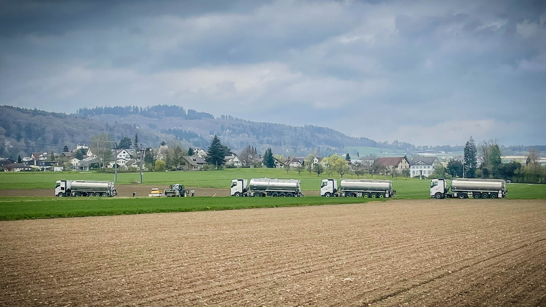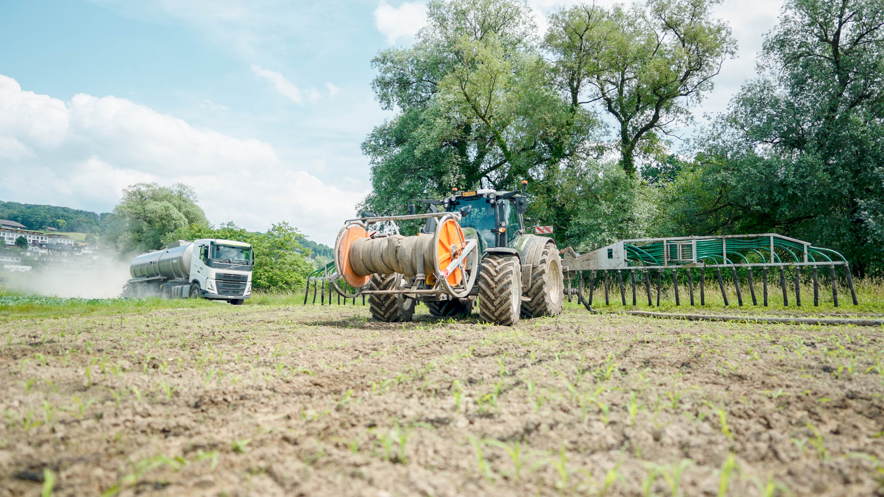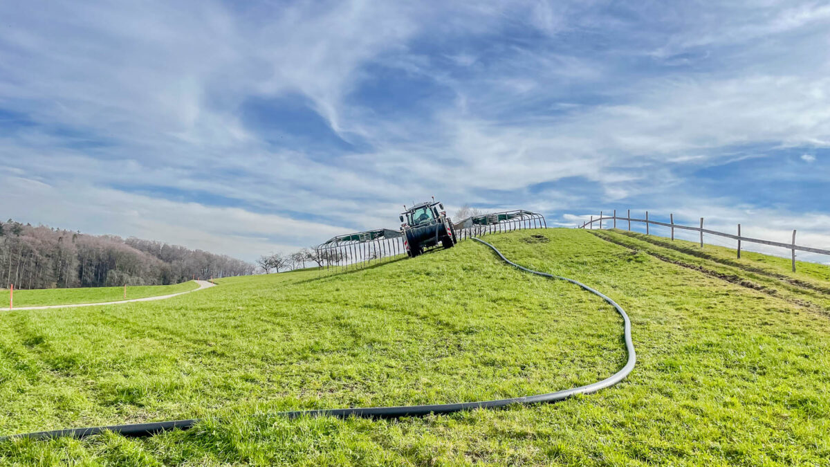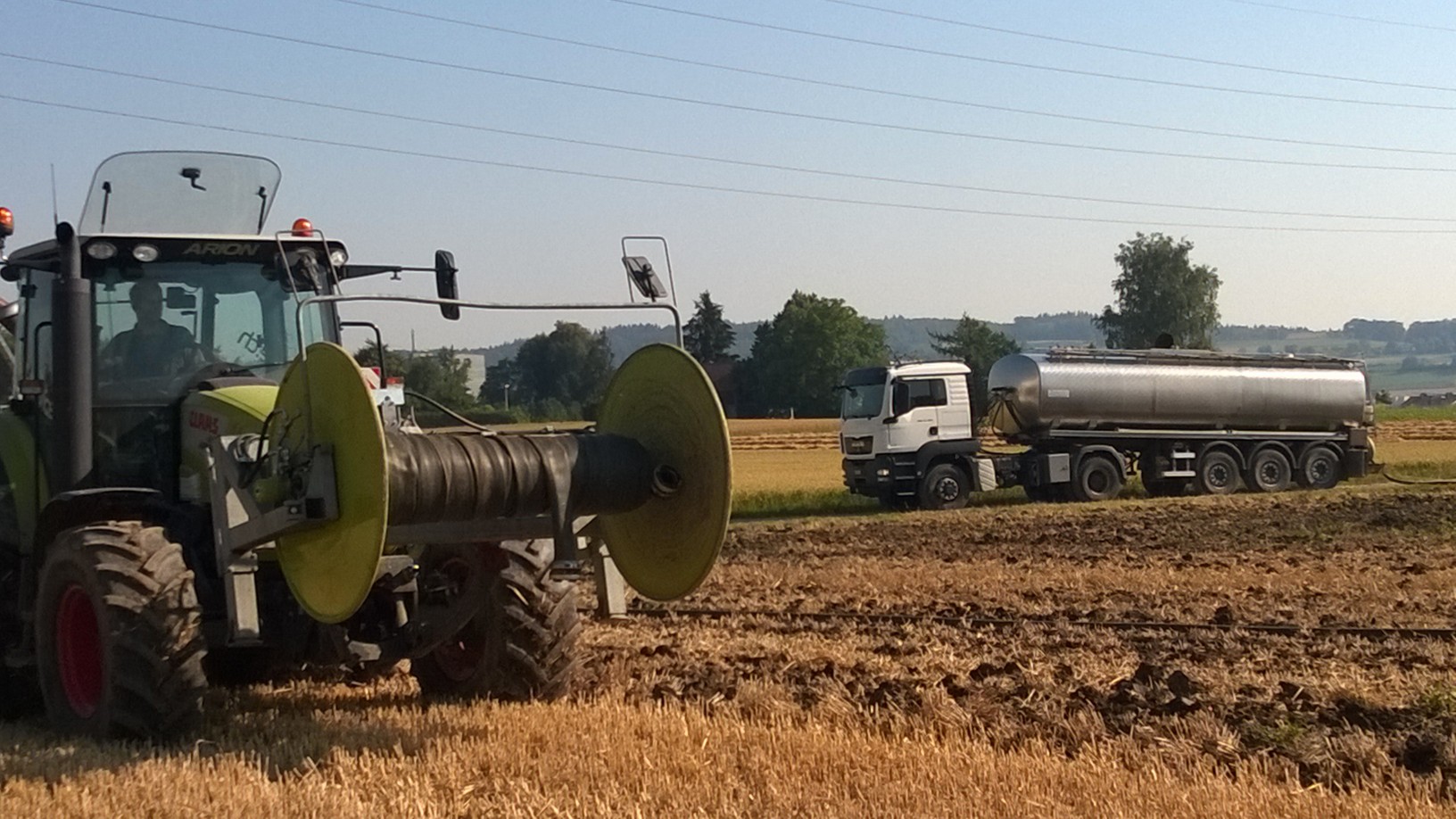 Bis zu einer Distanz von 1km pumpen wir die Nährstoffe direkt mit unserer leistungsstarken, fernbedienten Schneckenpumpe. Ist die Transportdistanz grösser, führen wir die Gülle mit unseren LKW an den Feldrand und verschlauchen von dort. Nach getaner Arbeit spülen wir die Schläuche mit Wasser und blasen diese mit Pressluft aus.