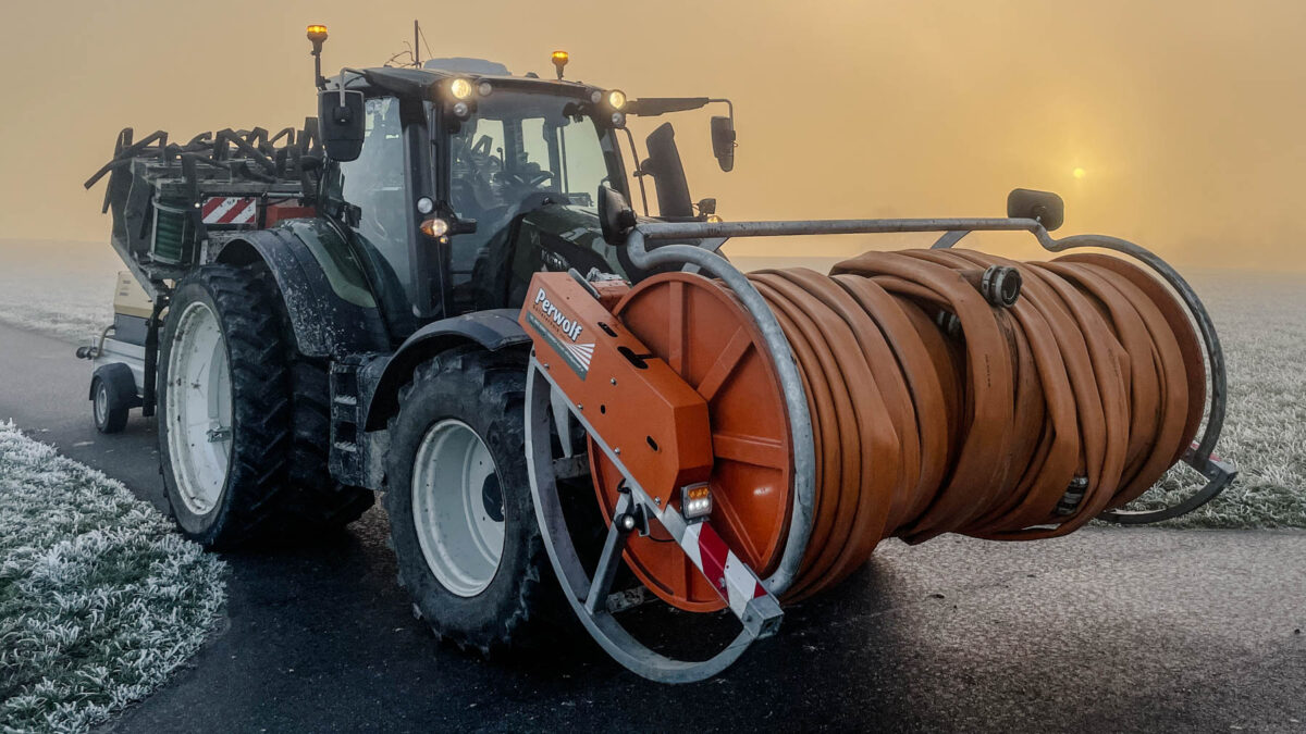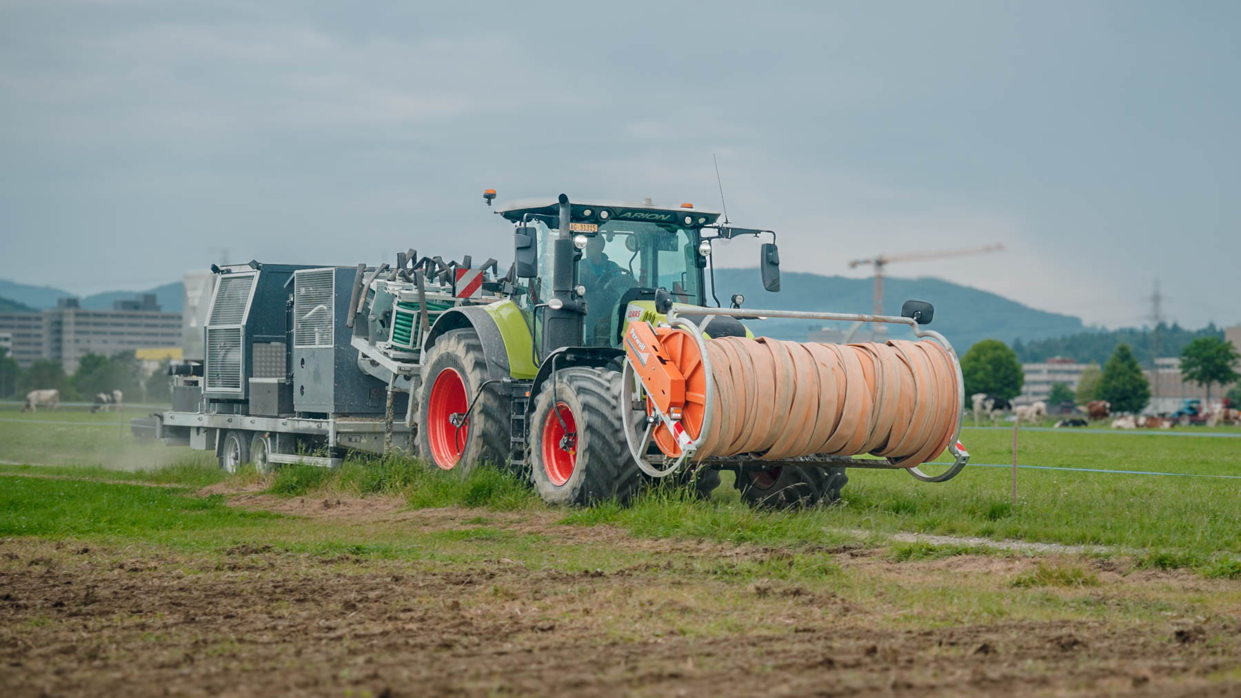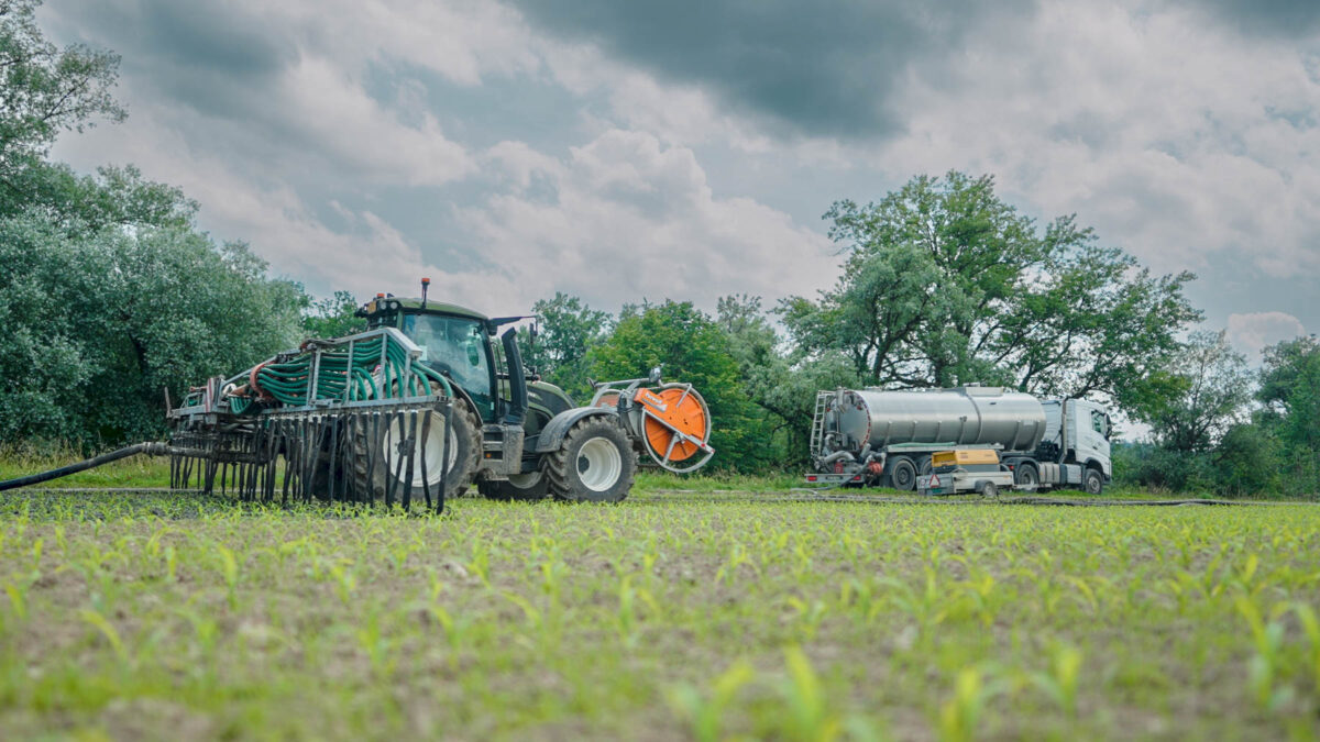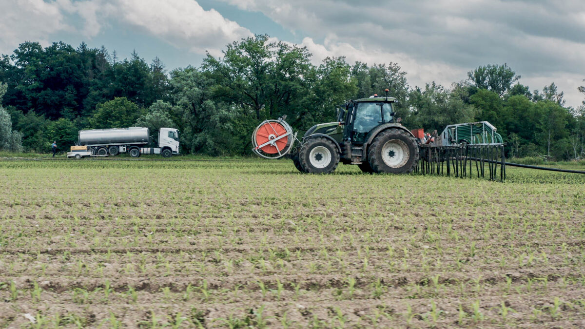 Bis zu einer Distanz von 1km pumpen wir die Nährstoffe direkt mit unserer leistungsstarken, fernbedienten Schneckenpumpe. Ist die Transportdistanz grösser, führen wir die Gülle mit unseren LKW an den Feldrand und verschlauchen von dort. Nach getaner Arbeit spülen wir die Schläuche mit Wasser und blasen diese mit Pressluft aus.