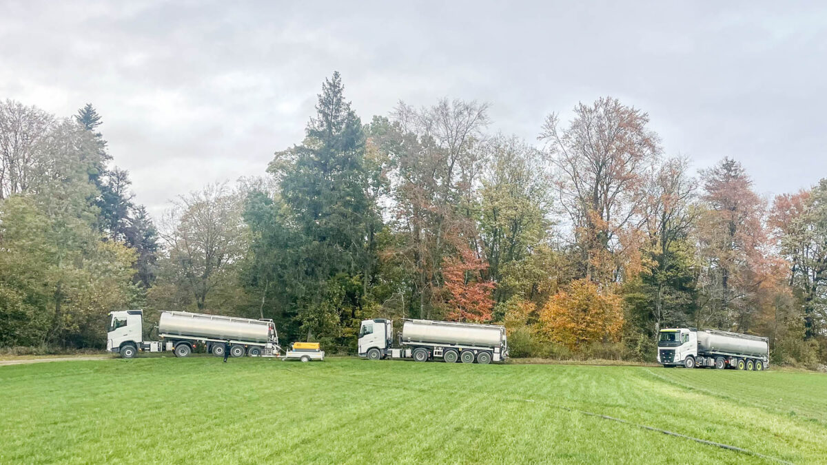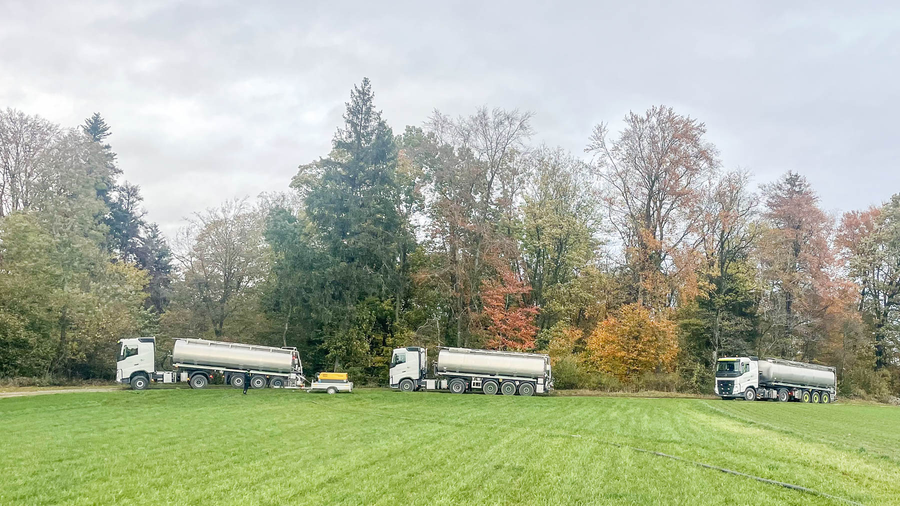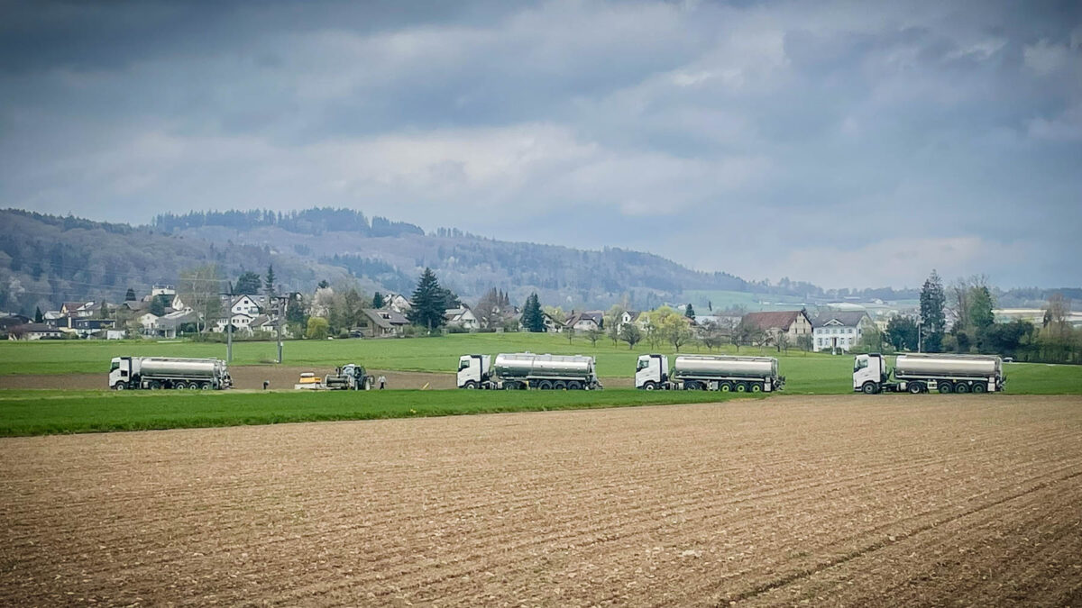 Sobald Parzellen zu weit vom Hof entfernt sind oder die Gülle von einem anderen Betrieb stammt, führen wir sie mit dem LKW an den Feldrand und verteilen von dort. Alle unsere LKW’s sind mit Pumpen ausgerüsten und können direkt verschlauchen.