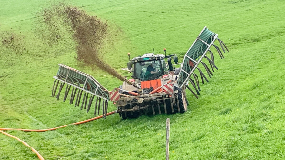 Nach jeder Parzelle blasen wir die Schläuche mit Pressluft aus. So ist sämtliche Gülle perfekt verteilt und wir können die Schläuche sauber aufrollen.