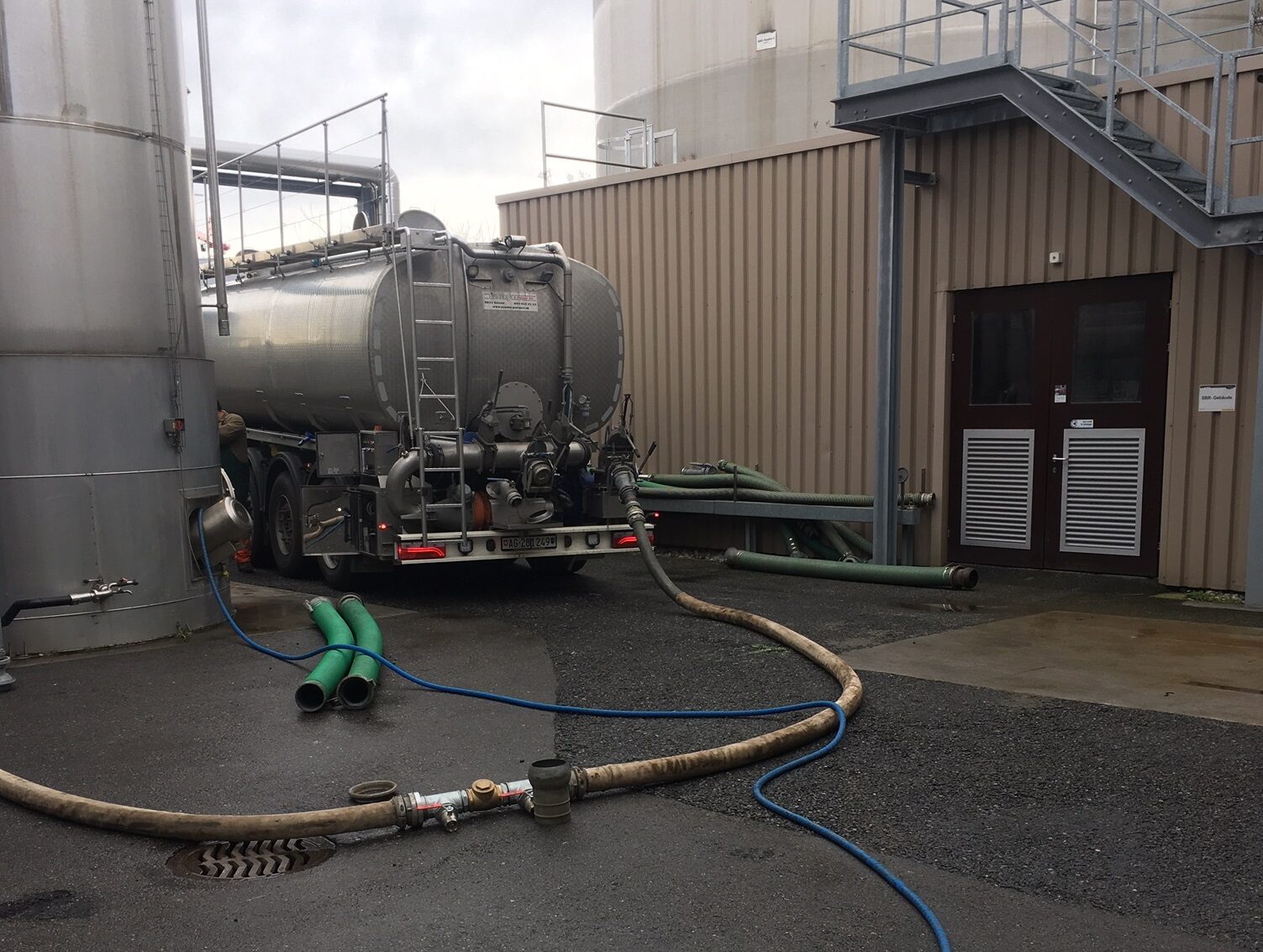 Die Fahrzeuge werden in der Regel ab Galgen befüllt. Mit selbst ansaugenden Pumpen können wir aber jedes Becken, selbst mit sehr dickflüssigem Material, entleeren.