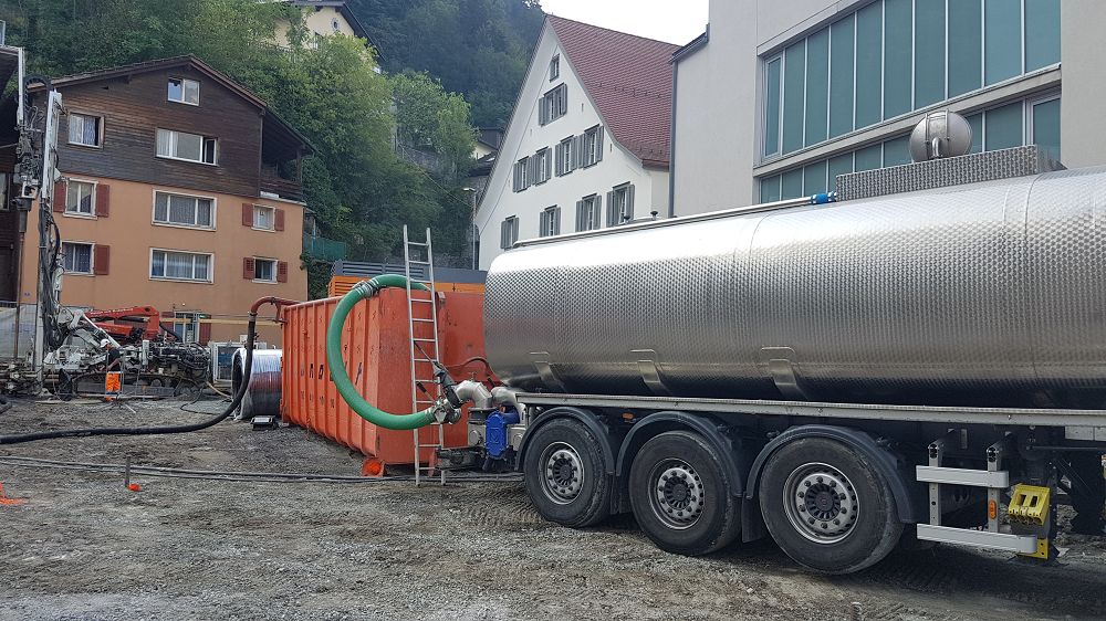 Bohrwasser, das frei von Kies und Steinen ist, laden wir selbstständig auf. Unsere Fahrzeuge verfügen über entsprechende Pumpen. Dank hoher Nutzlast führen wir pro Anfahrt grosse Mengen ab.